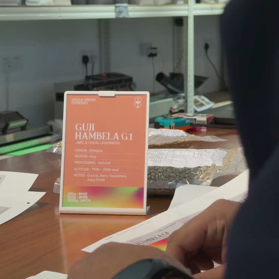 Hambela, in Ethiopia’s Guji region, is shaped by smallholder farmers cultivating coffee at high altitudes of 1,900–2,100 MASL, where cool temperatures slow cherry maturation and deepen flavour development. Farms are small and diverse, growing a mix of JARC-selected varieties alongside indigenous landraces, preserving both quality and genetic heritage. Natural processing is the method of choice, with whole cherries dried under the sun to amplify sweetness and complexity in the cup. The result is a coffee that reflects Hambela’s elevation, varietal richness, and time-honoured practices — expressive, layered, and unmistakably Ethiopian.
